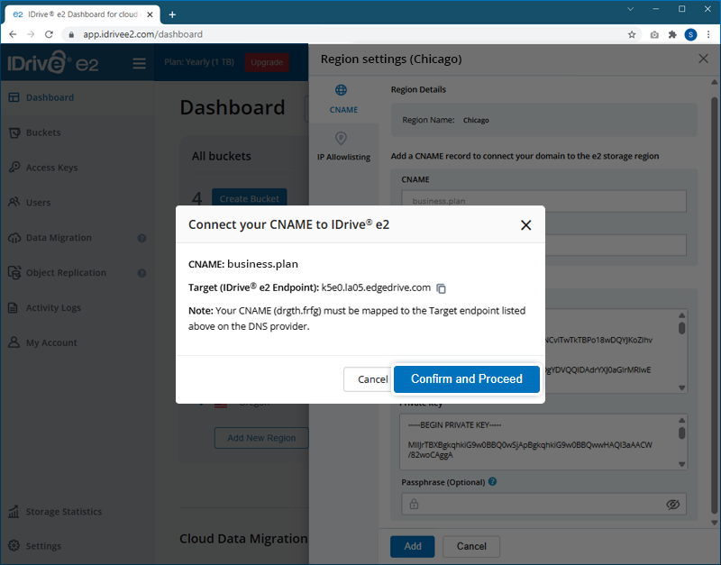 - Ensure the CNAME is mapped to the Target IDrive® e2 endpoint on the DNS provider, and provide your confirmation to proceed.