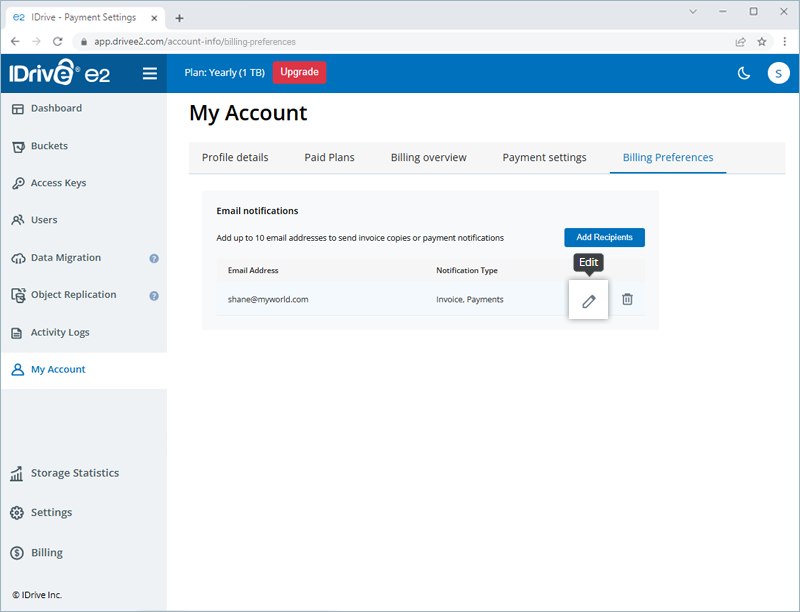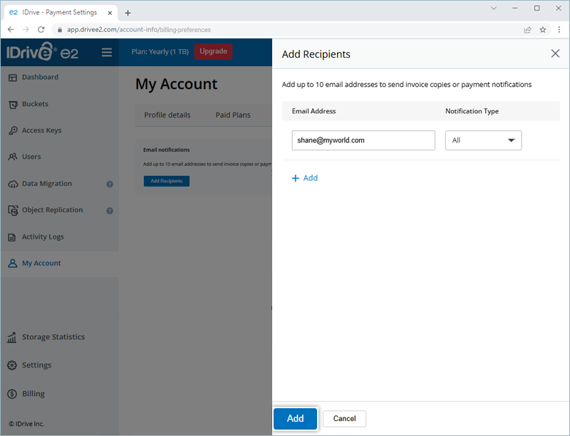 Can I add an email recipient to my IDrive® e2 account for receiving invoices and payment emails?