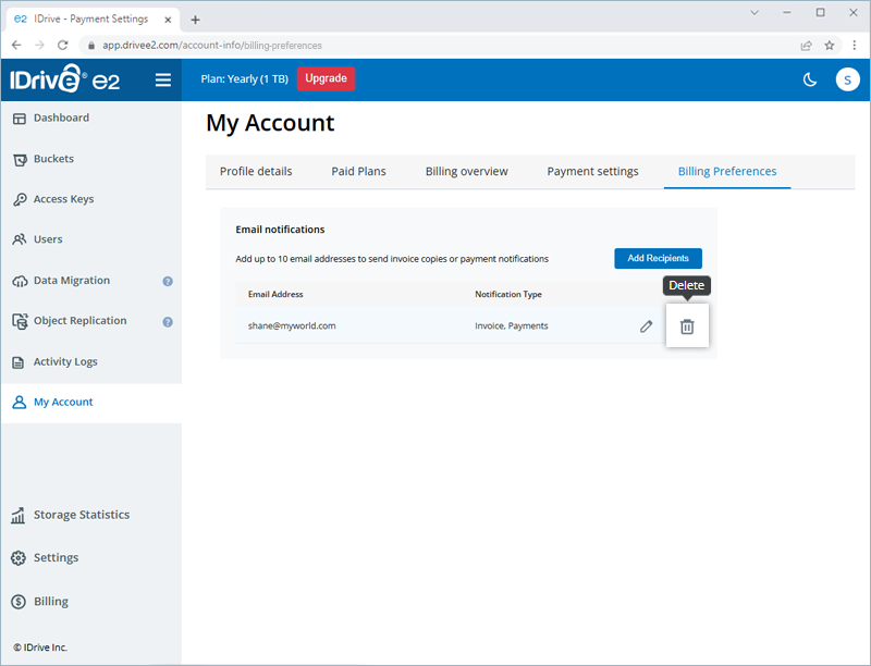 faq Can I add an email recipient to my IDrive® e2 account for receiving invoices and payment emails?