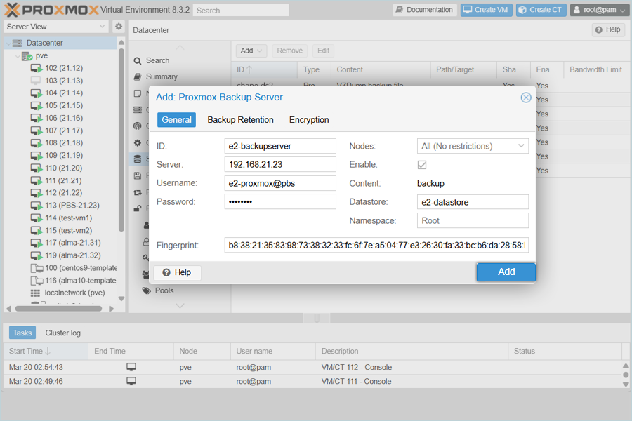 (Note: The Fingerprint will be available in your Proxmox Backup server under Certificates. Double-click on the listed certificate, and in the Certificate Details window, the Fingerprint will be displayed.) - Click Add.