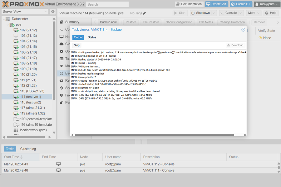 - The Backup of the VM starts. You can observe backup progress and summary in the Task viewer.