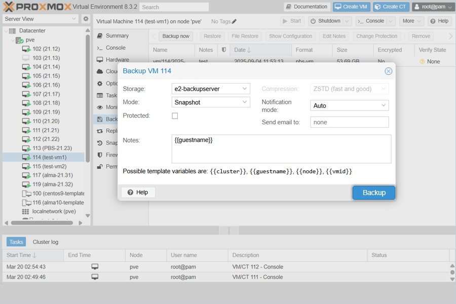 - In the Proxmox Virtual Environment, select the Virtual Machine that you want to back up.