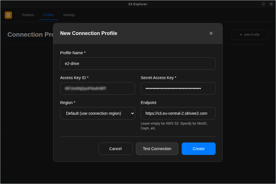 - Enter your IDrive® e2 S3 endpoint as the Endpoint.