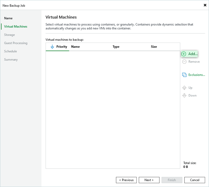 - Click the Add in Virtual Machines tab to select the Proxmox virtual machine for backup.